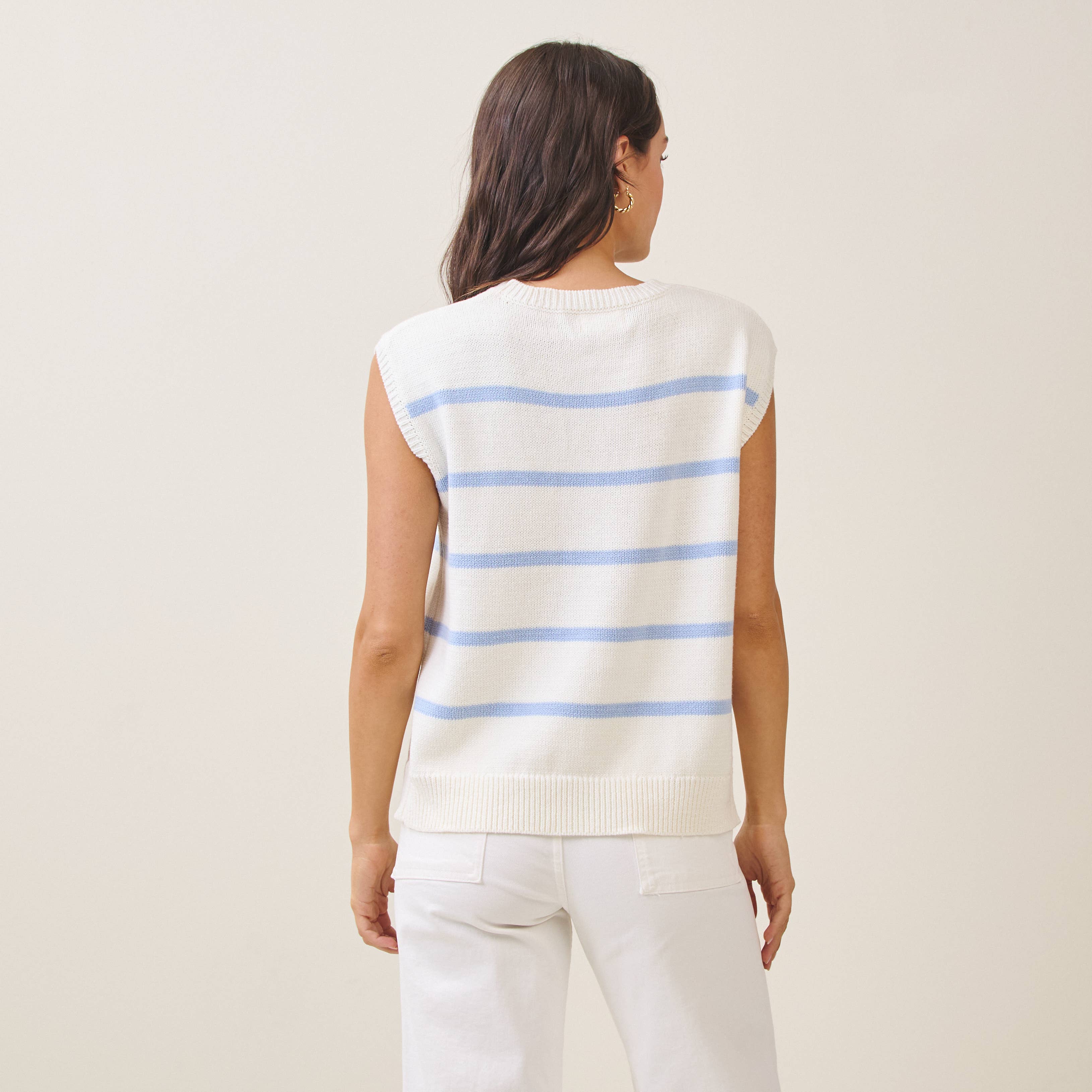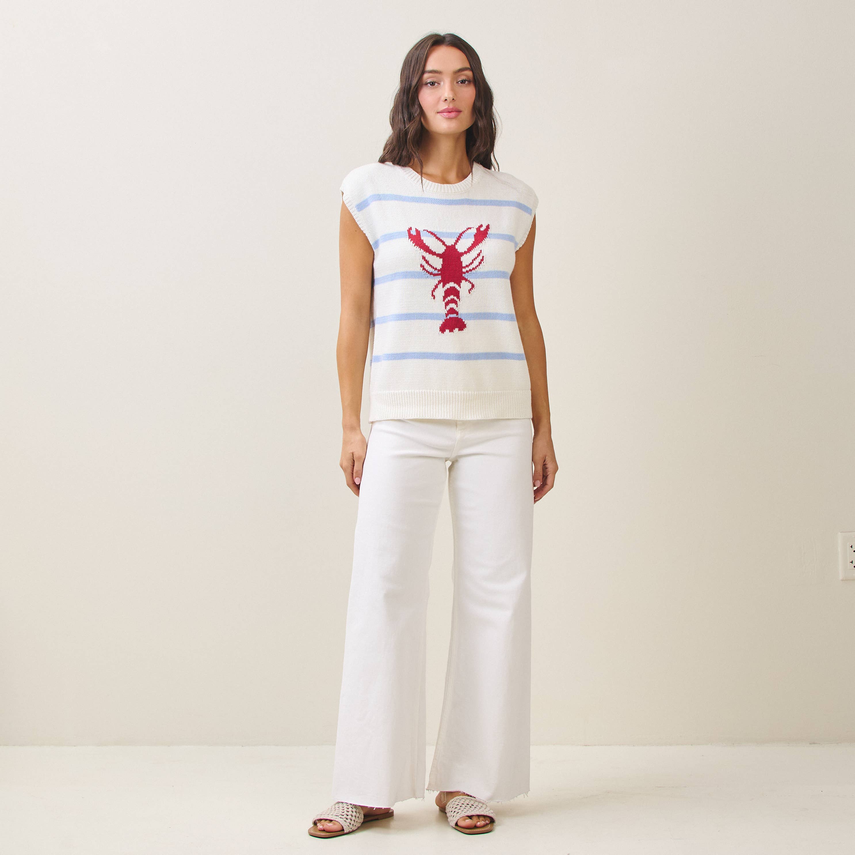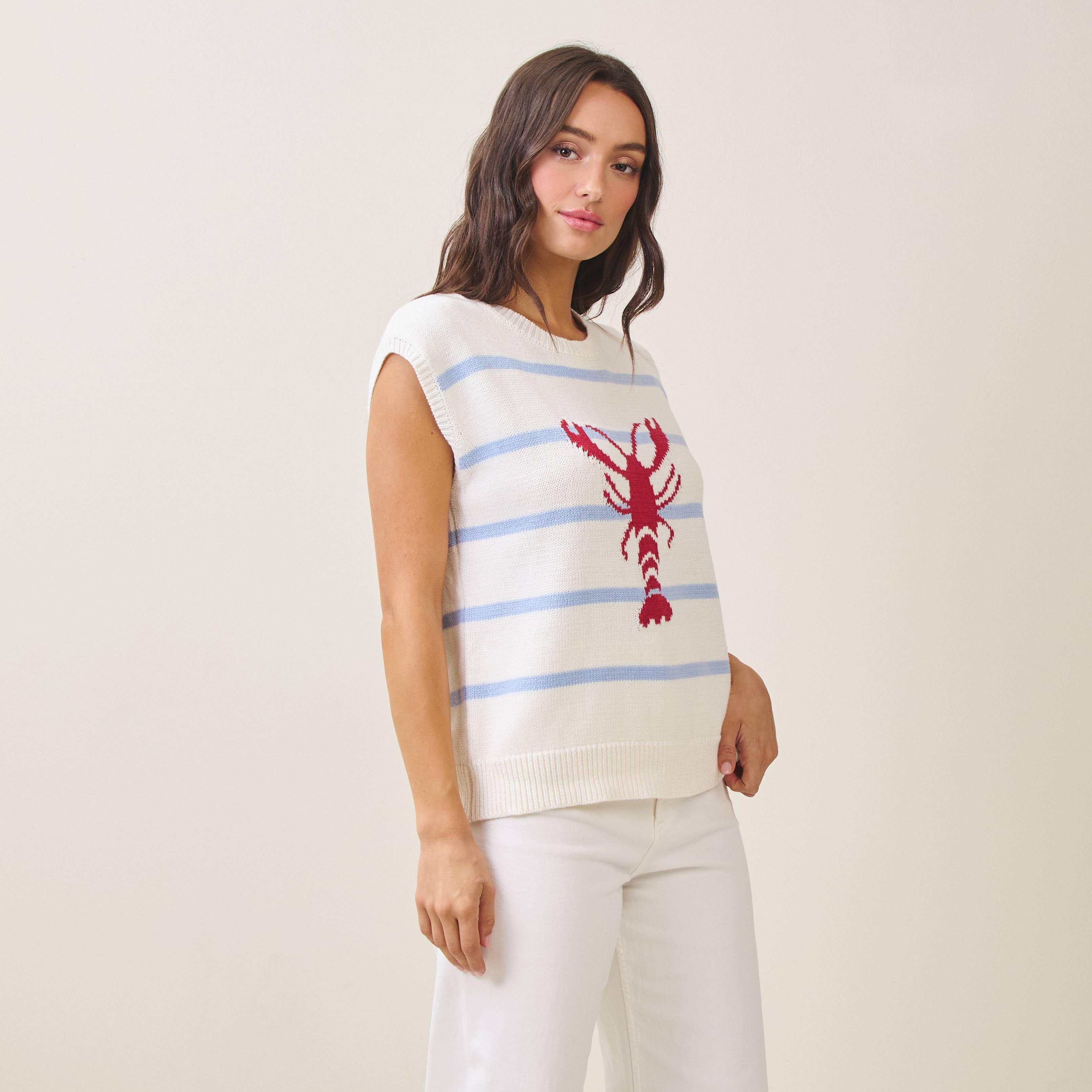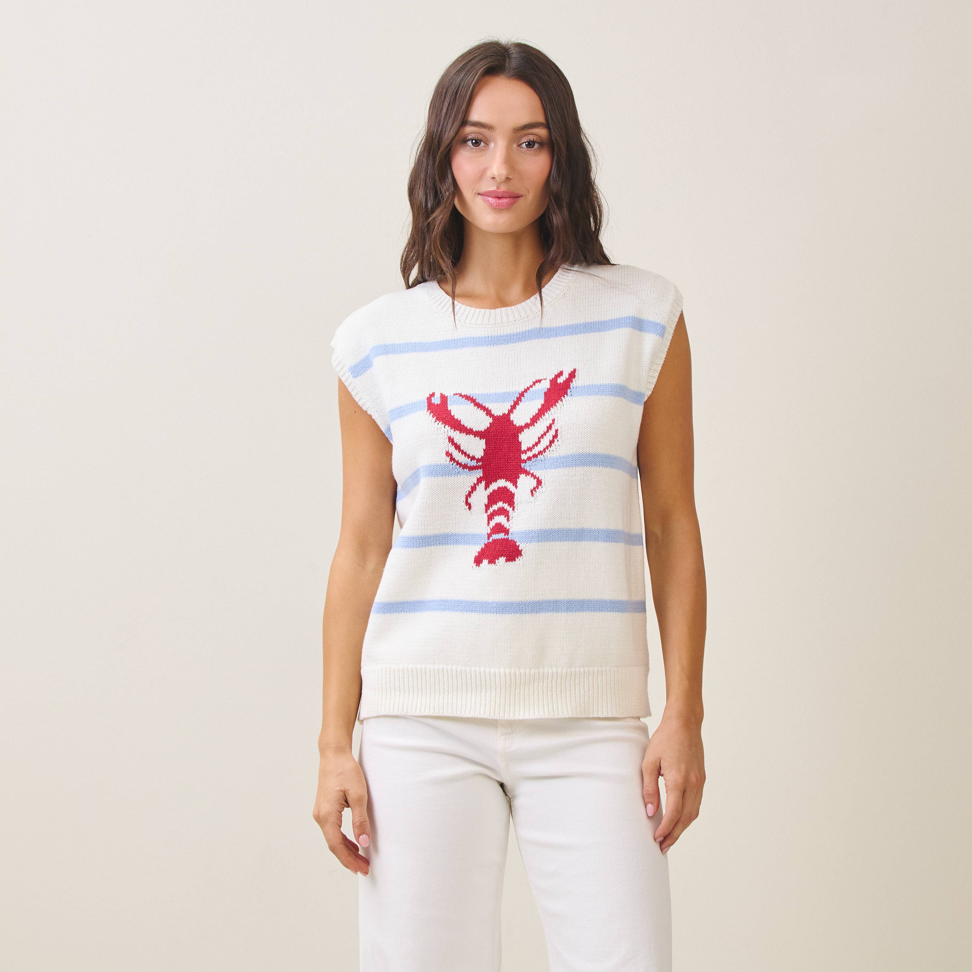 Effortless layering meets coastal charm with this sleeveless knitted vest. Crafted from a breathable cotton and acrylic blend, it features a playful striped lobster design perfect for adding personality to any outfit. The relaxed fit works beautifully over tees or as a standalone piece.