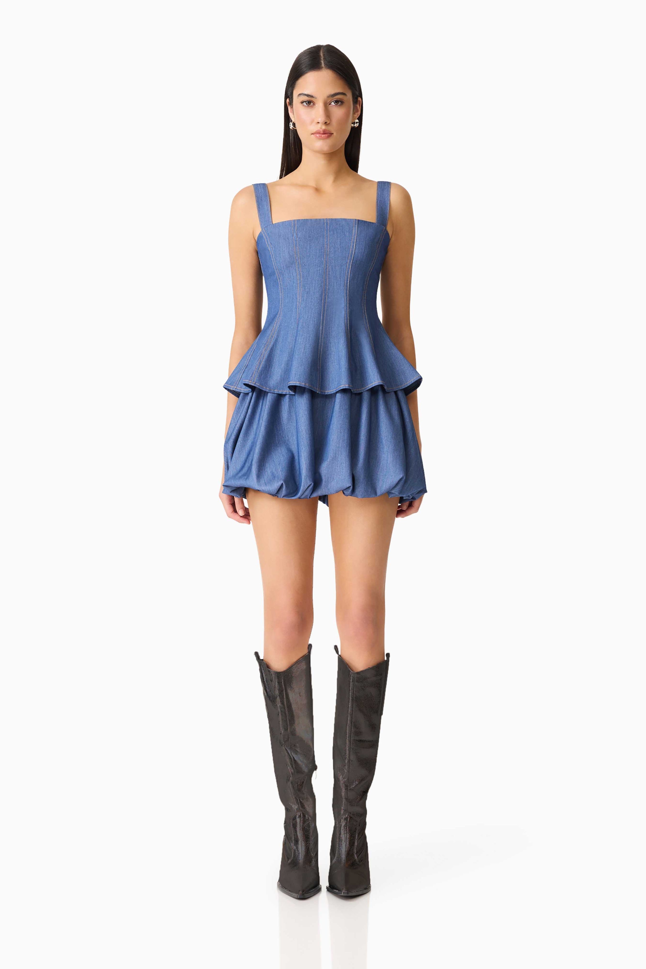 The Gaelle Mini Skirt features a refined A-line silhouette with a distinctive bubble hem that creates movement and visual interest. Crafted from structured woven fabric with no stretch, this piece offers a crisp, polished aesthetic. The shirred elastic panel detailing at the waist ensures a secure, comfortable fit while maintaining the skirt's elegant fit-and-flare proportions. Perfect for those seeking a statement piece that balances contemporary design with timeless appeal.