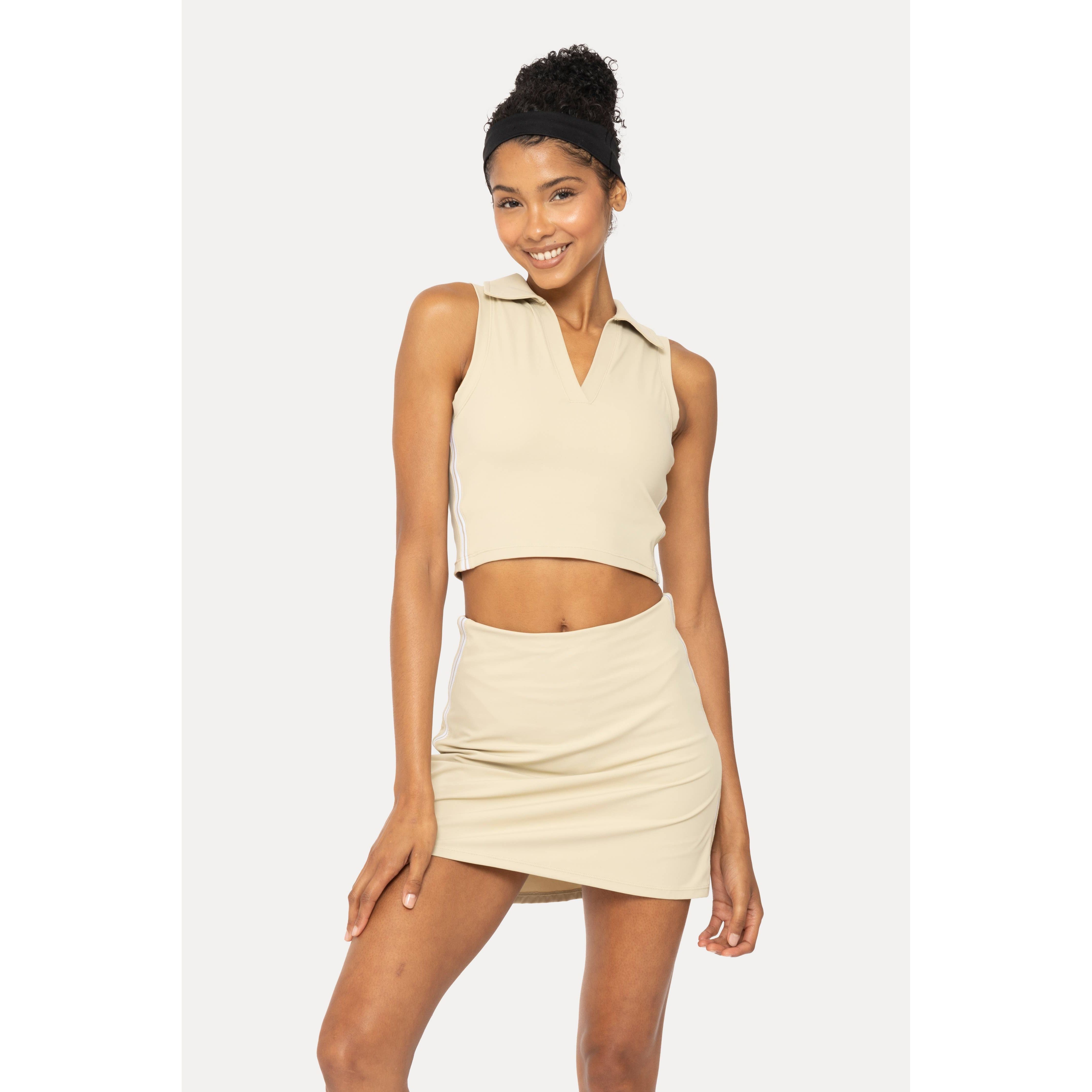A springtime essential! Our collared tennis crop top comes with full built in bra support, a supportive power mesh lining, and a retro side stripe.