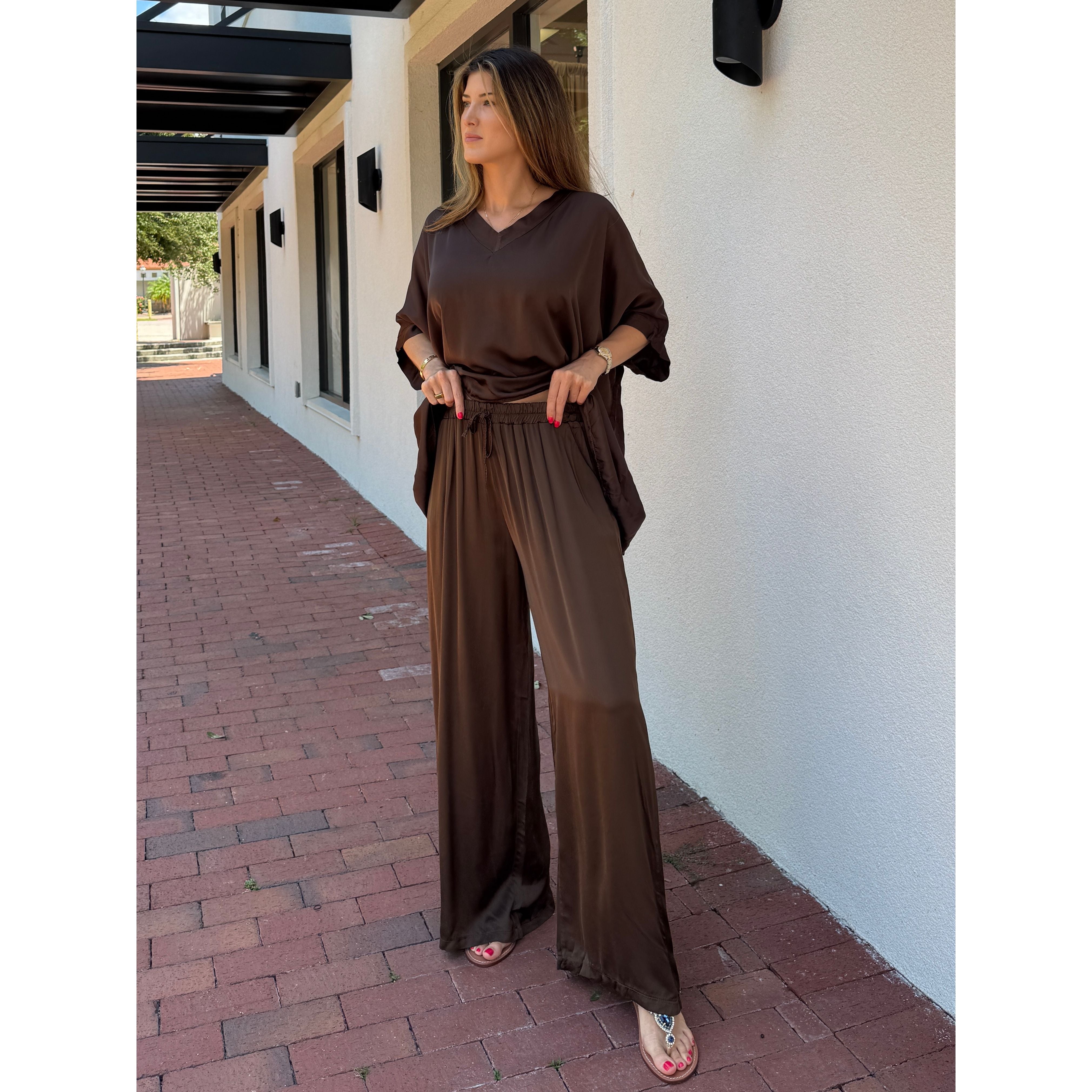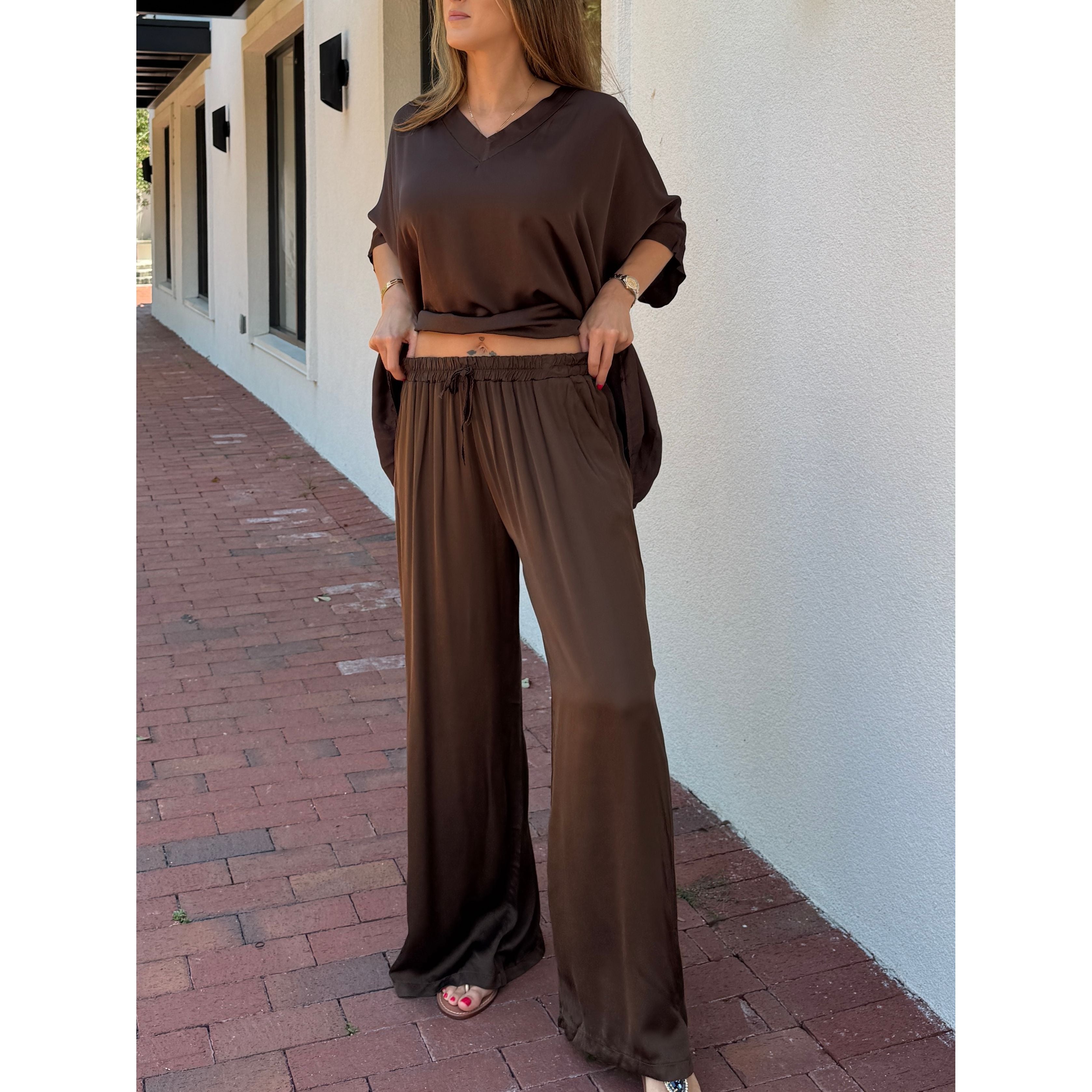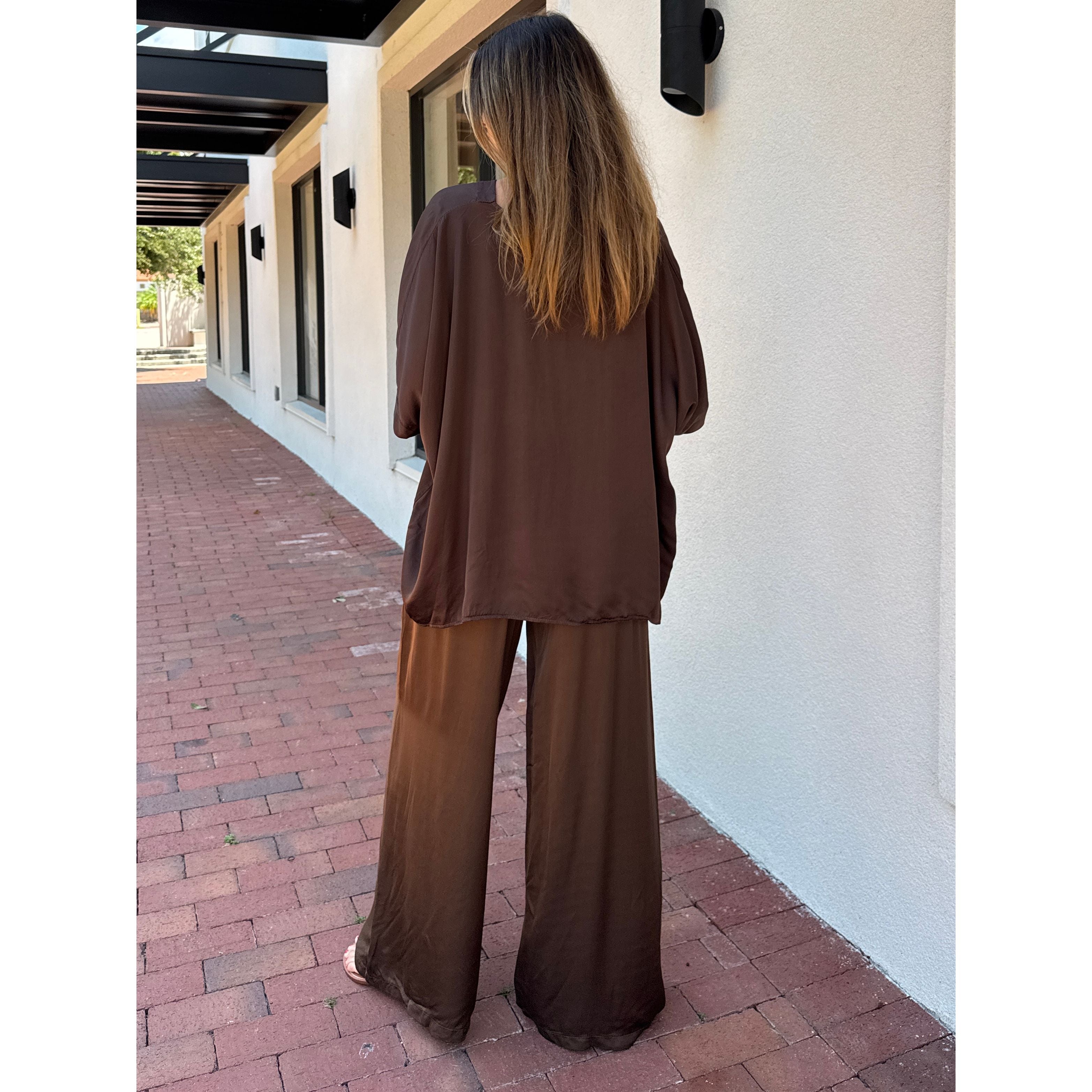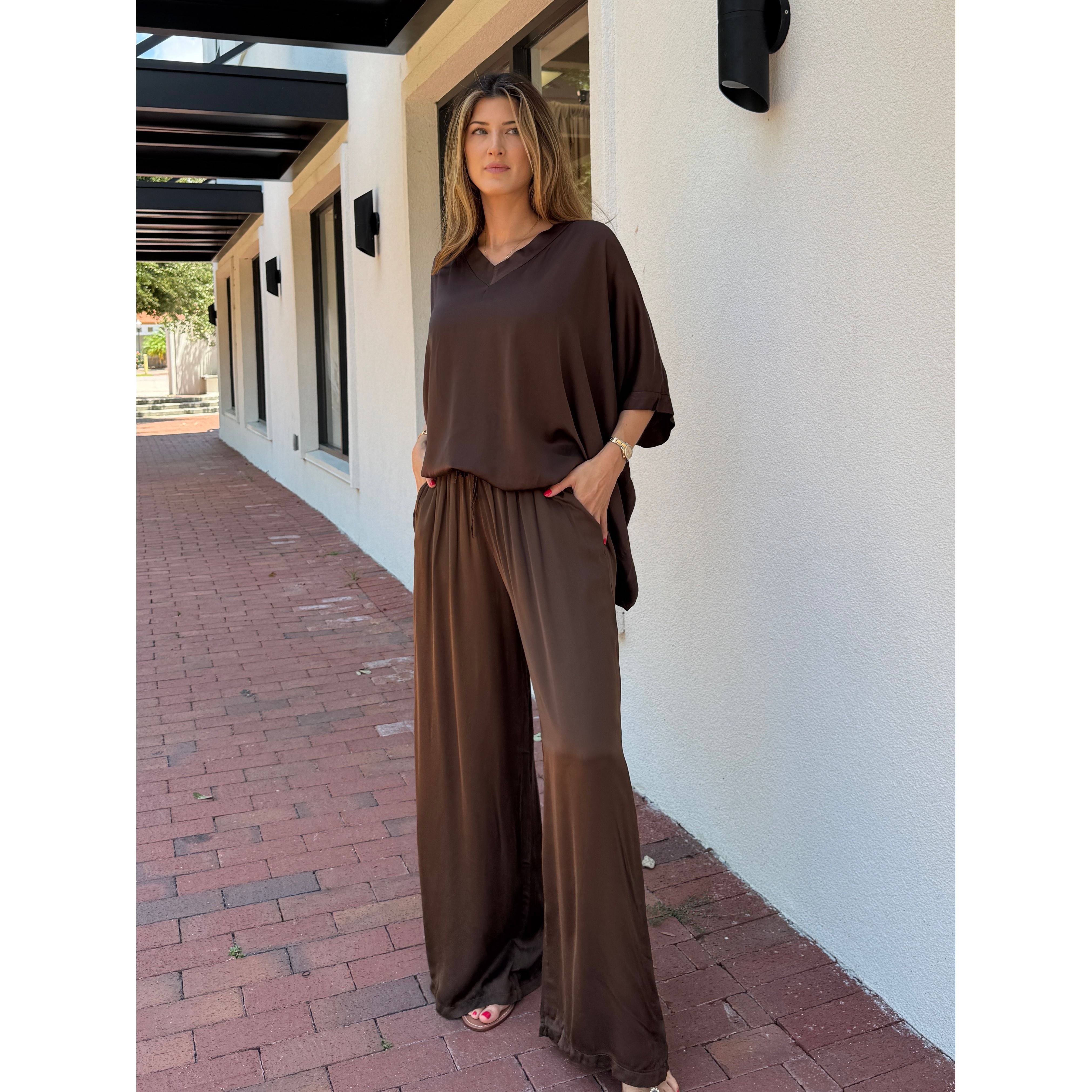 Experience luxury and comfort with these Solid Satin Pants, expertly crafted in Italy from an 80% viscose and 20% silk blend. The heavy-weight satin offers a refined, flowy drape that moves gracefully, while the soft drawstring waist ensures a customizable fit and pockets for added comfort. Perfect for elegant yet relaxed styling, these pants deliver a sophisticated silhouette with exceptional softness and durability.