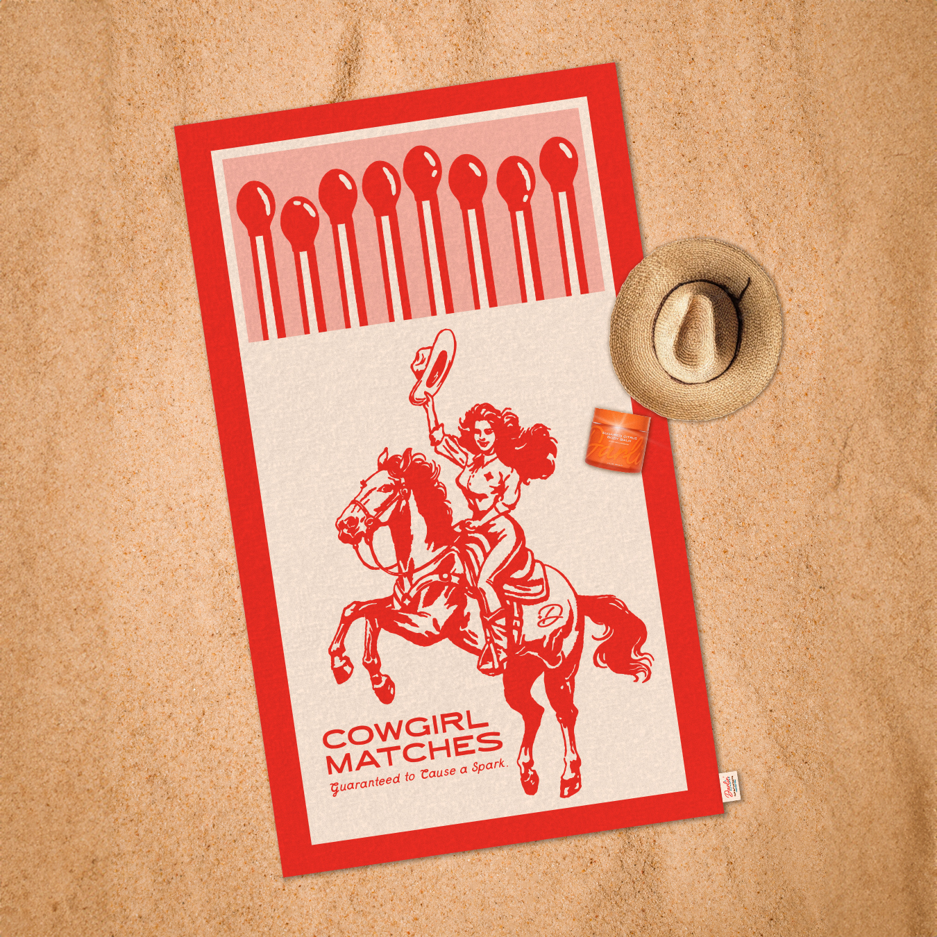 Our Cowgirl Matches Towel is a plush, oversized statement piece made from 100% natural cotton and fully woven—never screenprinted—for rich detail and lasting quality. Dyed with NONTOXIC, fade-resistant pigments, it’s safe for skin, gentle on the planet, and designed to stay bold over time. It’s ultra-soft, quick-drying, and generously sized—perfect as a luxe beach towel, elevated bath towel, or eye-catching Western decor accent. ❤️ Why You’ll Love It: ❤️ • Oversized + plush for beach or bath • Woven design = rich, durable texture • Nontoxic, fade-proof dyes • Cowgirl matchbook art = bold & collectible • Doubles as decor, gift, or throw • This is not your average towel—it’s a functional piece of art. Loved by cowgirls, clean beauty fans, beach goers and anyone who appreciates natural materials, thoughtful design, and a little bit of yeehaw glam. 🤠