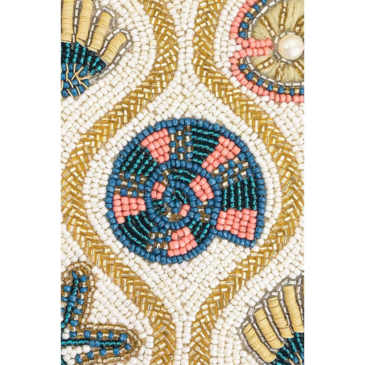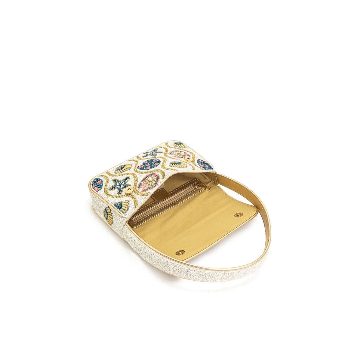 The Sunlit Shore Embellished Shoulder Bag features intricate beaded shell motifs on a structured silhouette, combining elegance with coastal inspiration. Its flap closure secures with dual magnetic snaps, while glossy golden PU binding highlights the edges for a refined finish. Inside, the smooth beige poly lining includes a zip pocket and a back slip pocket with hidden magnetic closure, offering organized storage. Measuring 10" x 5.5" x 2", this bag adds a subtle shimmer to elevate any ensemble.