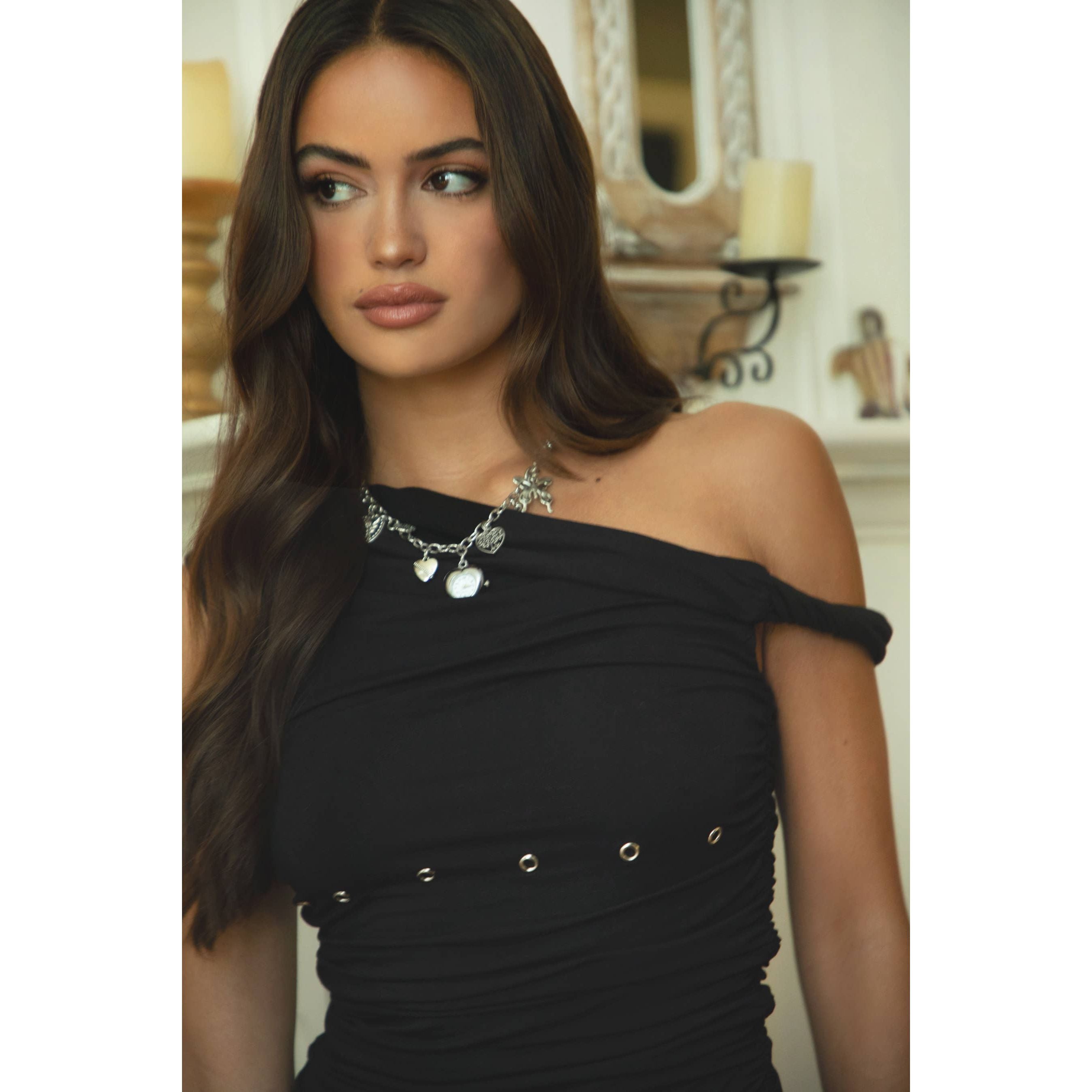 The Azalea Asymmetrical Mini Dress combines contemporary design with versatile styling. Featuring a striking one-shoulder silhouette with twisted strap detail, this piece showcases exposed studded embellishments across the torso for an edgy touch. Strategic ruching at the seams creates flattering dimension, while the flirty hemline and integrated shorts-style lining ensure comfort and confidence. Crafted from stretch rayon-spandex jersey, the fabric moves with you through any occasion—from casual summer outings to back-to-school moments and boho-inspired gatherings. An effortless statement piece that transitions seamlessly across seasons.