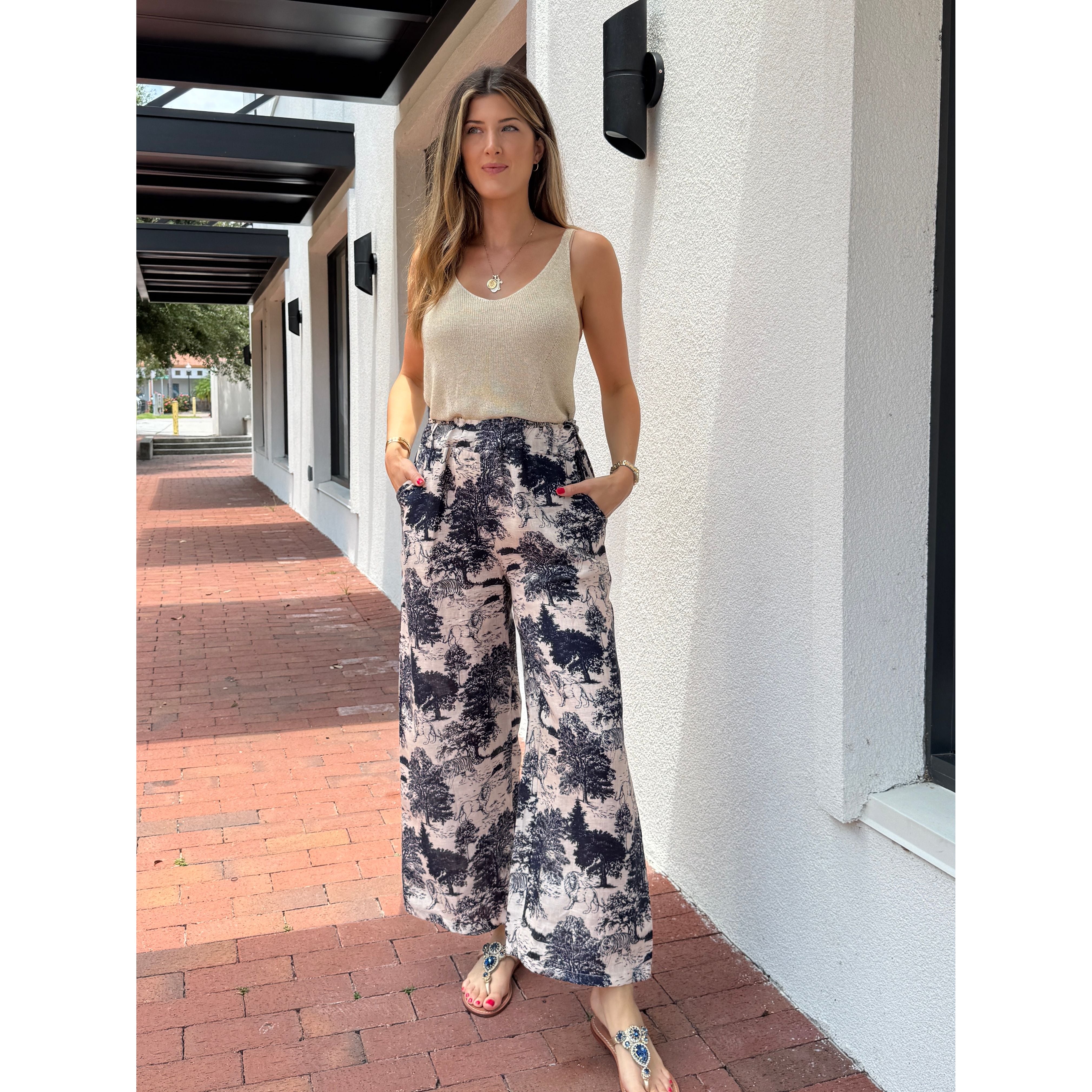 Elevate your wardrobe with the Lion Safari Pant, expertly crafted from 100% linen fabric handmade in Italy. Featuring a subtle, high-fashion-inspired safari print with lions, tigers, and trees, these pants balance elegance with adventurous spirit. The elastic high waist ensures a comfortable, tailored fit, while side pockets add practical convenience. Perfect for those who appreciate refined design and premium craftsmanship.