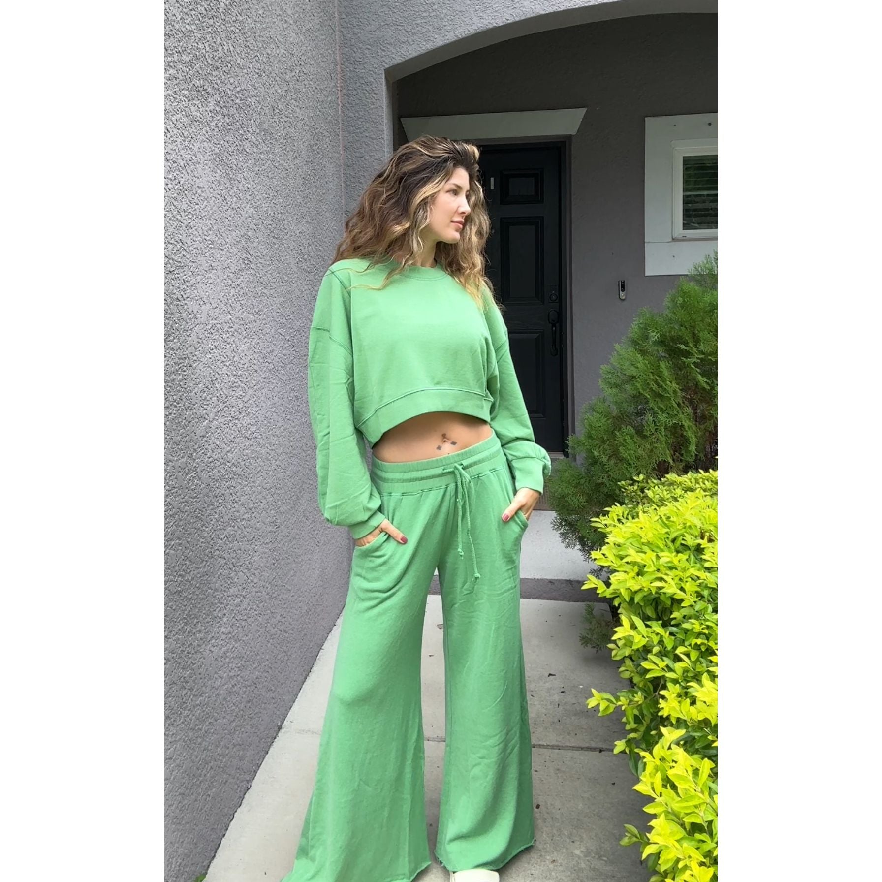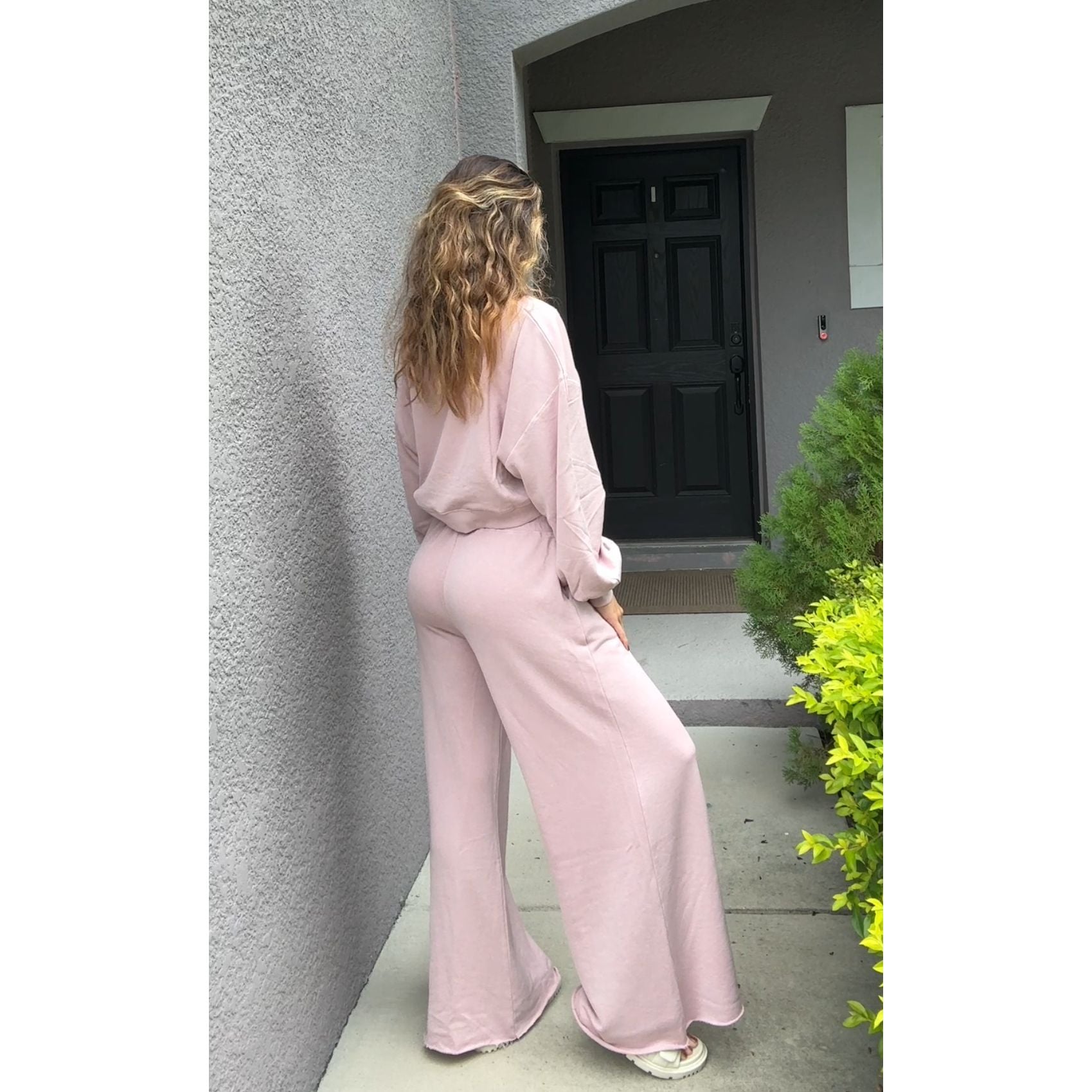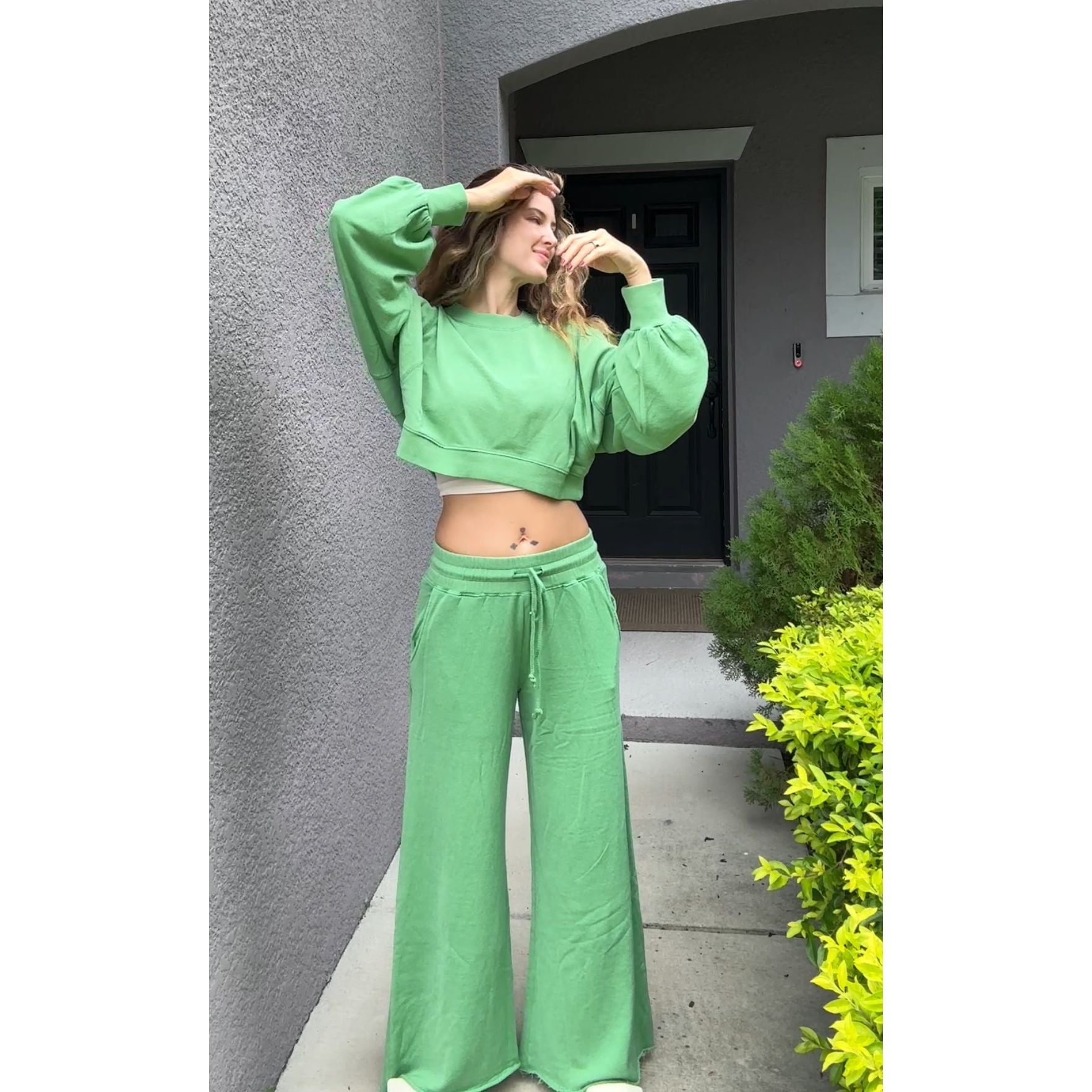 The Harbor Lounge Set from LaBiz combines comfort and style with a mineral wash cropped sweater top and matching wide-leg pants featuring an elastic waistband. Crafted from a cozy blend of 60% cotton and 40% polyester, this best-selling set offers breathable softness and easy wearability, perfect for relaxed days at home or casual outings.
