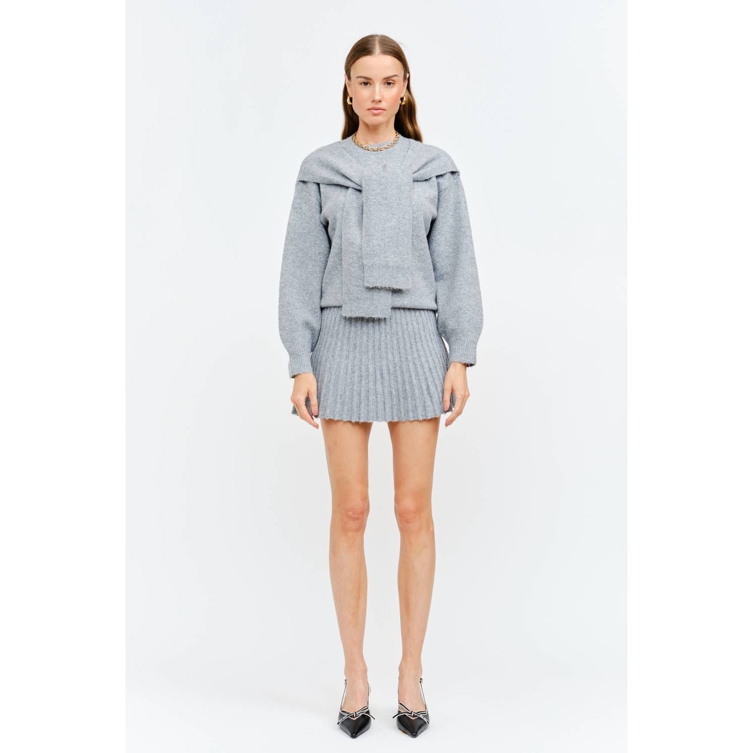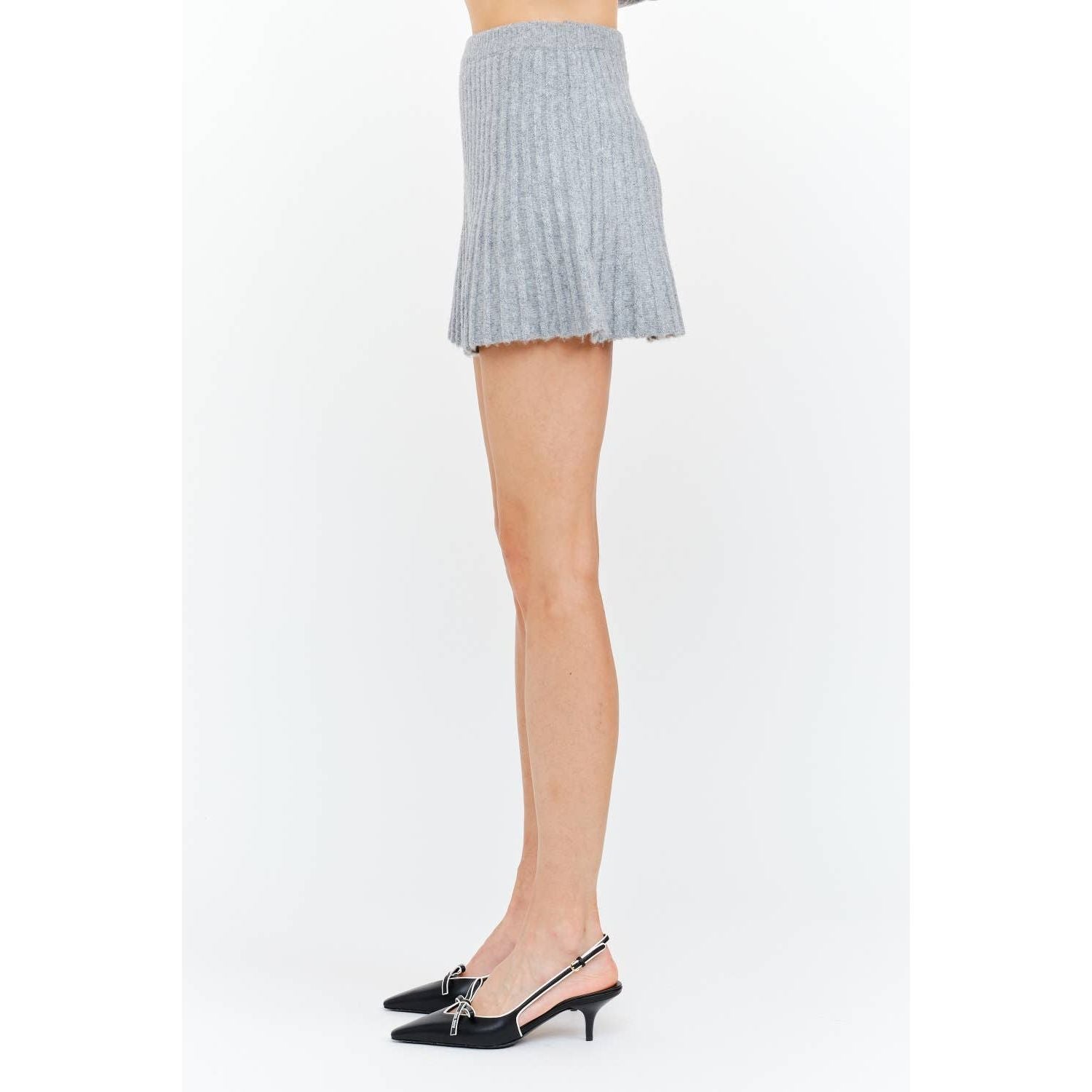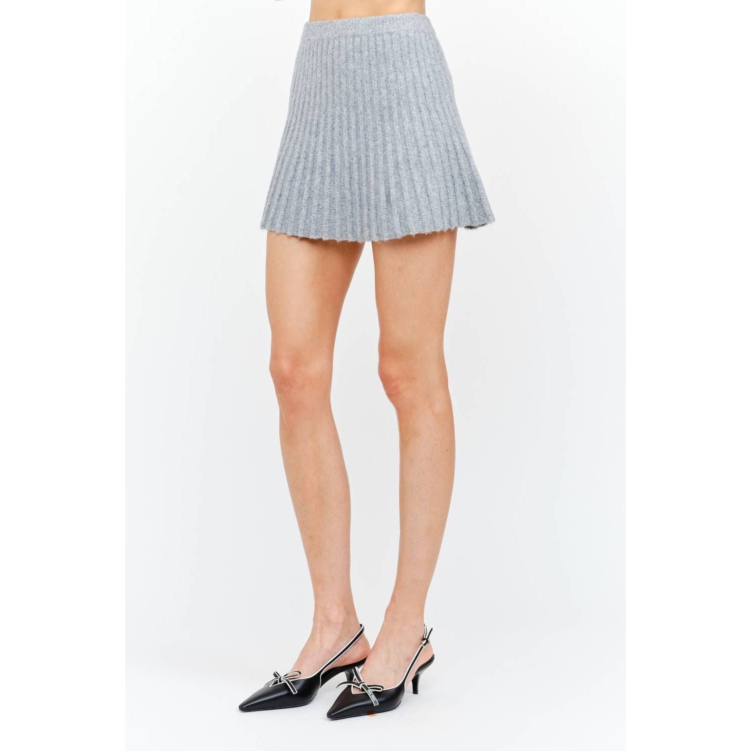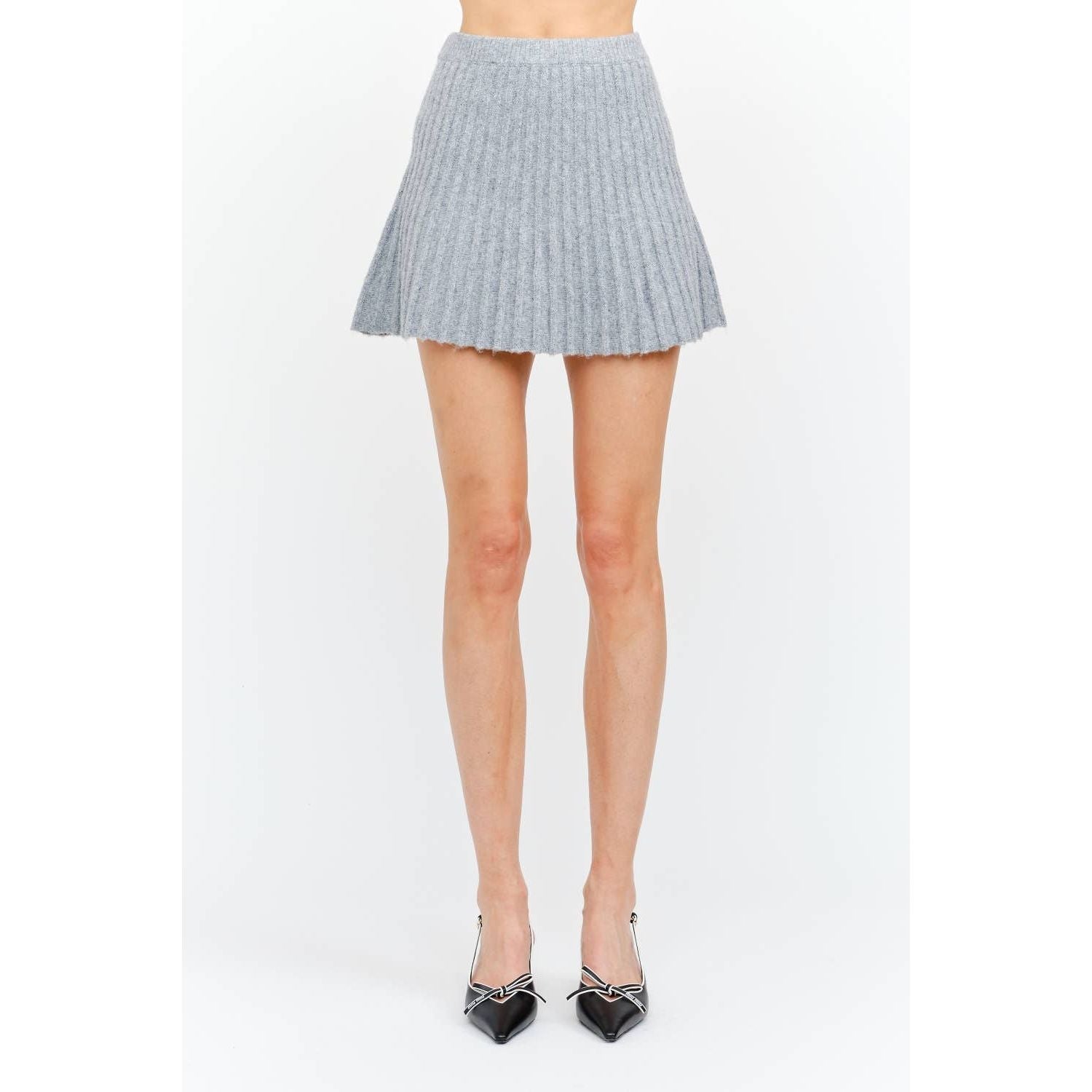 The Maude Heather Gray Knit Skirt combines contemporary design with everyday wearability. This pleated mini skirt features a soft, textured knit in a versatile heather gray that transitions seamlessly from casual to polished occasions. The structured pleats create dynamic movement while the stretch knit fabric ensures all-day comfort without restriction. An elastic waistband allows for effortless dressing, making this piece ideal for those seeking both style and practicality. Hand wash cold and line dry to maintain the fabric's integrity and shape.