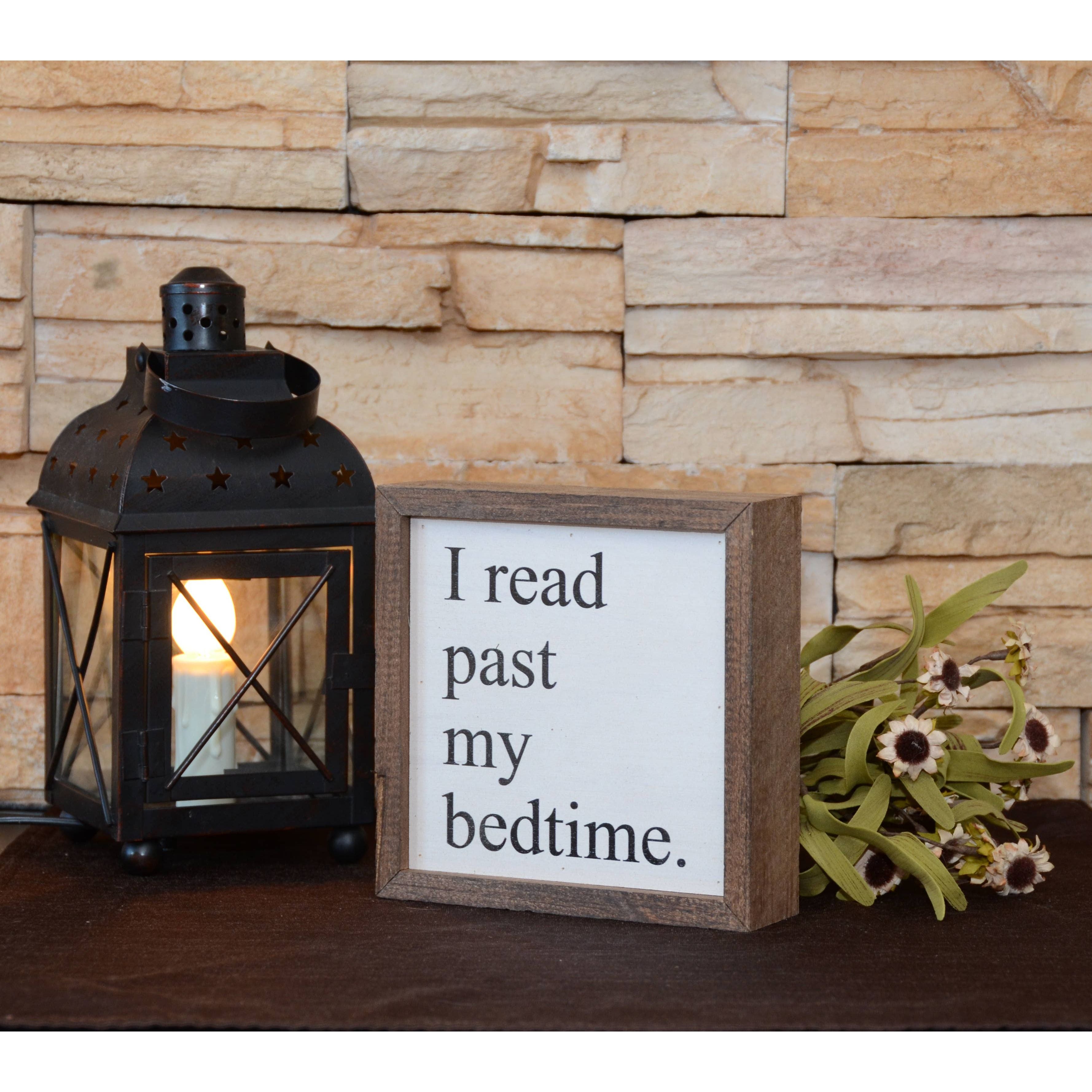 I Read Past My Bedtime Wood Sign. All our signs are build into a wooden box frame with a rustic touch. Signs are hung directly off the frame or will stand up right on a table or shelf.