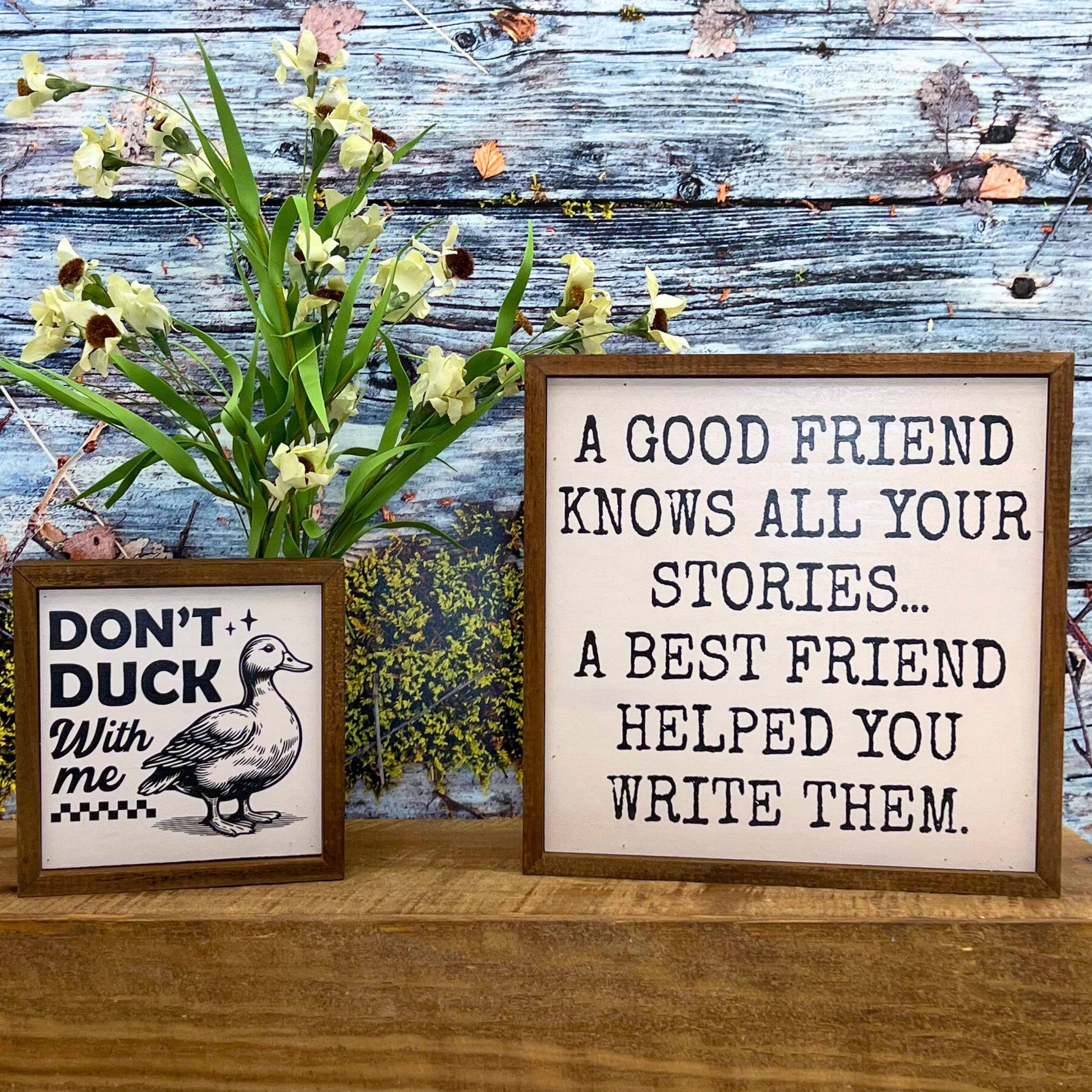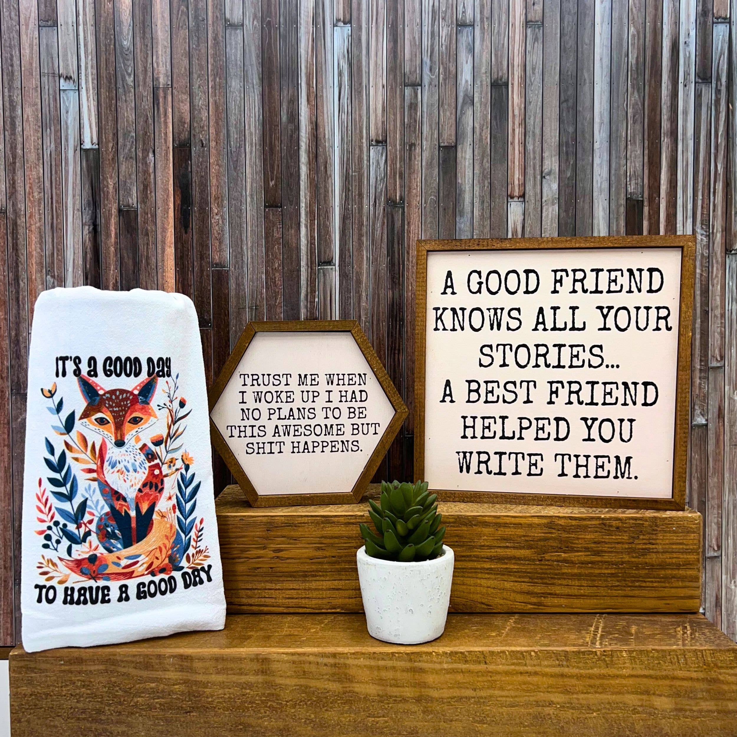 A Good Friend Knows All Funny Birthday Gift - Home Decor. All our signs are build into a wooden box frame with a rustic touch. Signs are hung directly off the frame. Keywords: Box Sign, Wall Hanging, Wood Signs, Kitchen Décor, Rustic Décor, wall art, Friend Gift