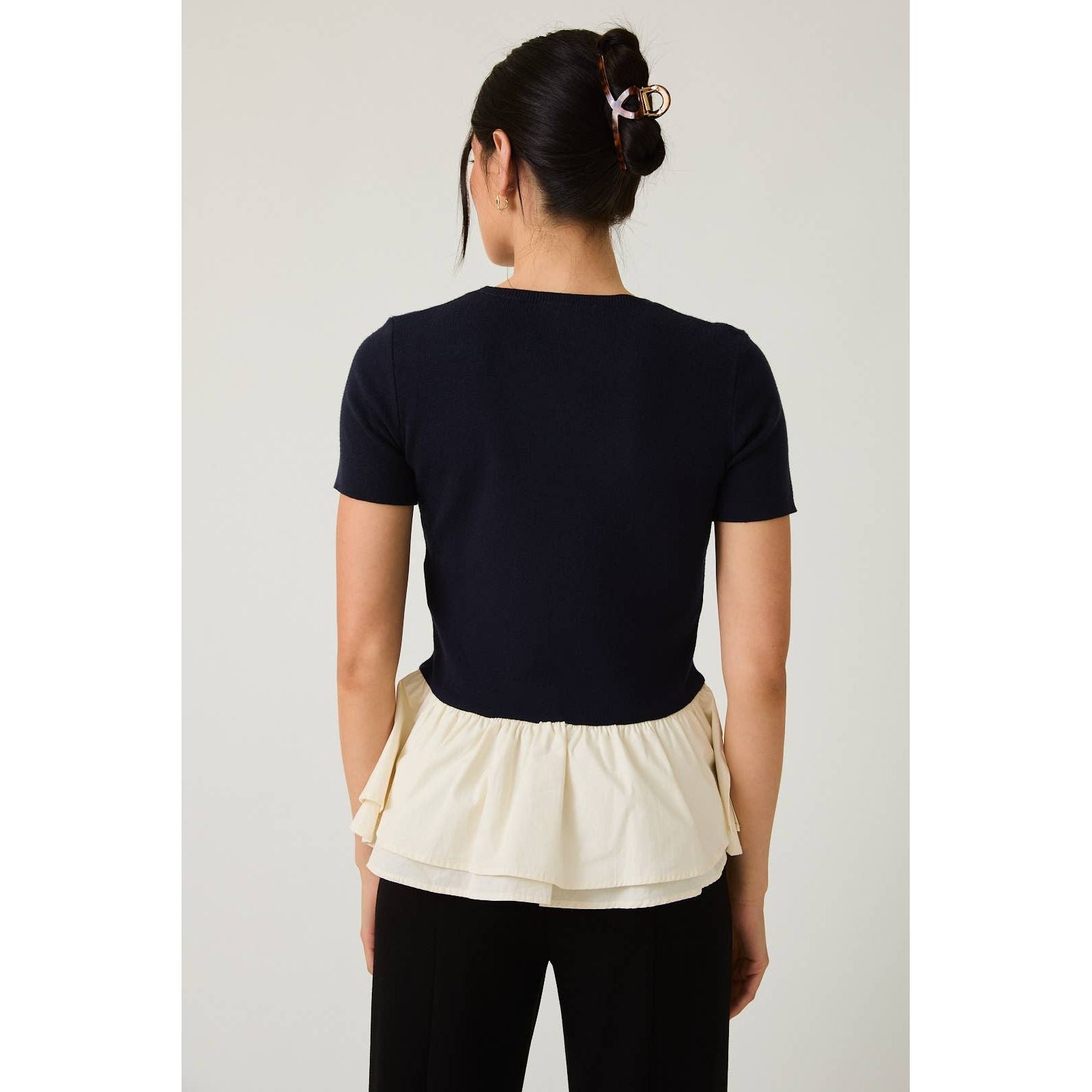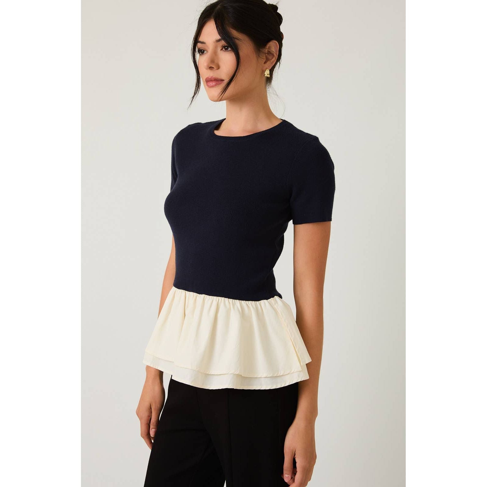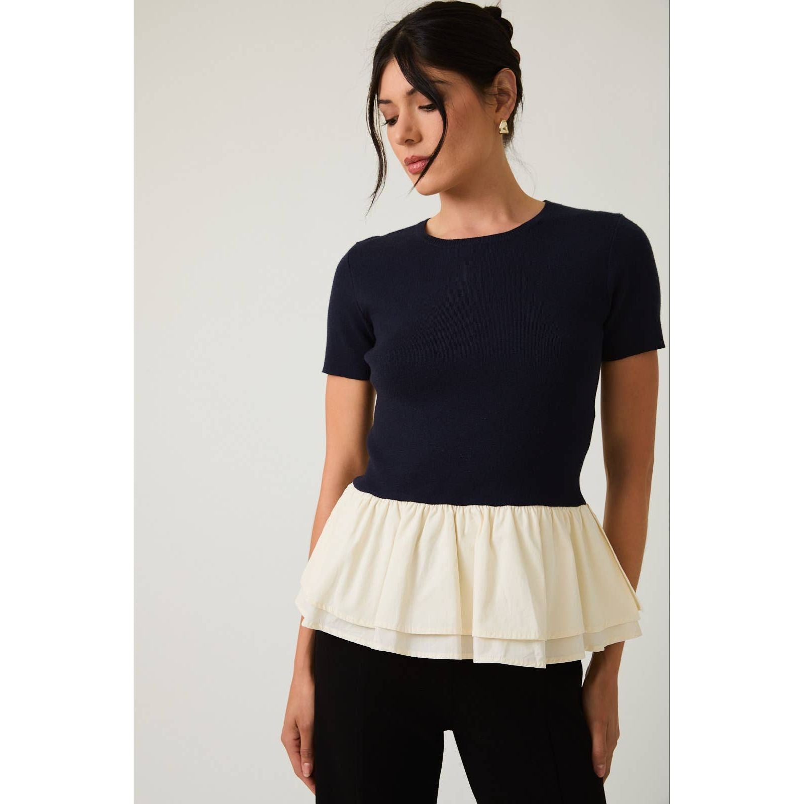 This sophisticated two-tone peplum top combines navy and cream hues to create a sleek, balanced look. The peplum silhouette enhances the waistline, offering a flattering, tailored fit ideal for both professional and casual settings. Crafted to complement diverse styles, this top adds structured elegance and subtle contrast, making it a versatile addition to any wardrobe.