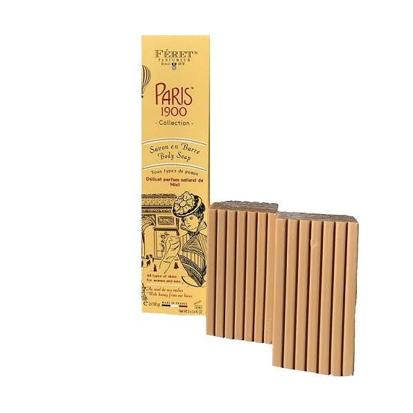 Indulge in the luxurious allure of our Paris 1900 Range, a homage to the elegance of the Belle Époque and Art Nouveau era, launched in 2020. Each bar of our exquisite honey soap is a testament to timeless craftsmanship and natural beauty, containing 97% ingredients of natural origin, including honey sourced directly from the hives at our Féret Parfumeur garden. Infused with nourishing olive oil and shea butter, this gentle soap envelops your skin in hydration, leaving it supple and refreshed, while its sweet, soothing fragrance transforms your bath into a fragrant escape. Perfectly packaged in a beautiful box of two 3.52oz (100g) soaps, this unisex product makes an ideal gift for loved ones seeking a touch of French elegance and self-care, all proudly made in France. Treat yourself or someone special to the ultimate skin indulgence!